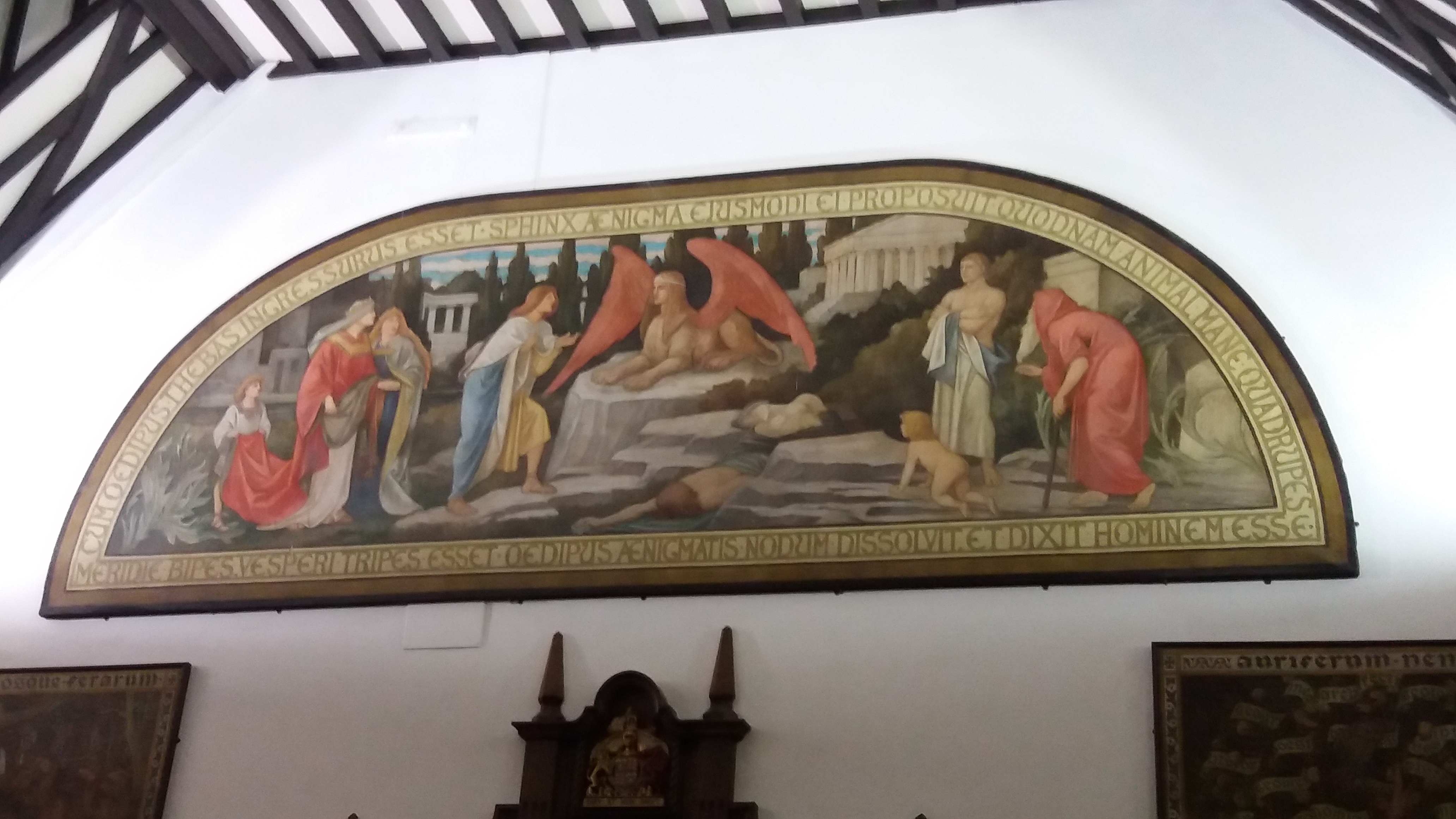 Also at the front of the Hall are a number of pictorial features. The one in the centre is a depiction of a part of the Oedipus myth where Oedipus encountered a Sphinx, who would stop all travellers to Thebes and ask them a riddle. If the travellers were unable to answer her correctly, they would be killed and eaten; if they were successful, they would be free to continue on their journey. The riddle was: “What walks on four feet in the morning, two in the afternoon and three at night? Oedipus answered: “Man: as an infant, he crawls on all fours; as an adult, he walks on two legs and; in old age, he uses a ‘walking’ stick”. Oedipus was the first to answer the riddle correctly and, having heard Oedipus’ answer, the Sphinx allowed him to carry on forward.