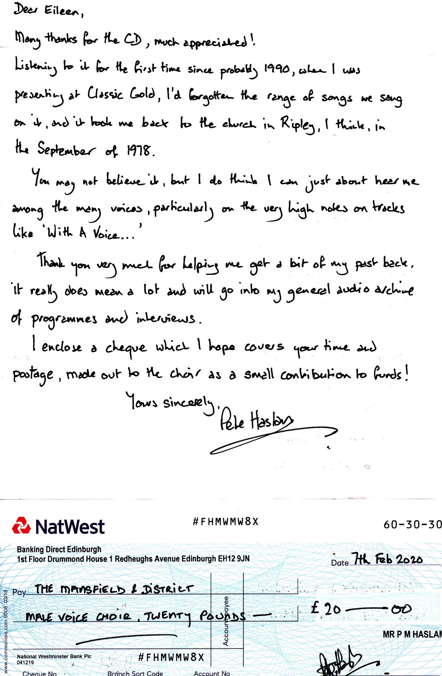 John kindly copied it on to a CD before Christmas 2019 and I sent it on to Peter in Hull. I have recently received a letter and cheque from Peter in thanks ( see below). What real pleasure it is to see camaraderie and association with our choir over distance and time. There is certainly something truly sustainable about belonging to a choir which makes your life just so much better.