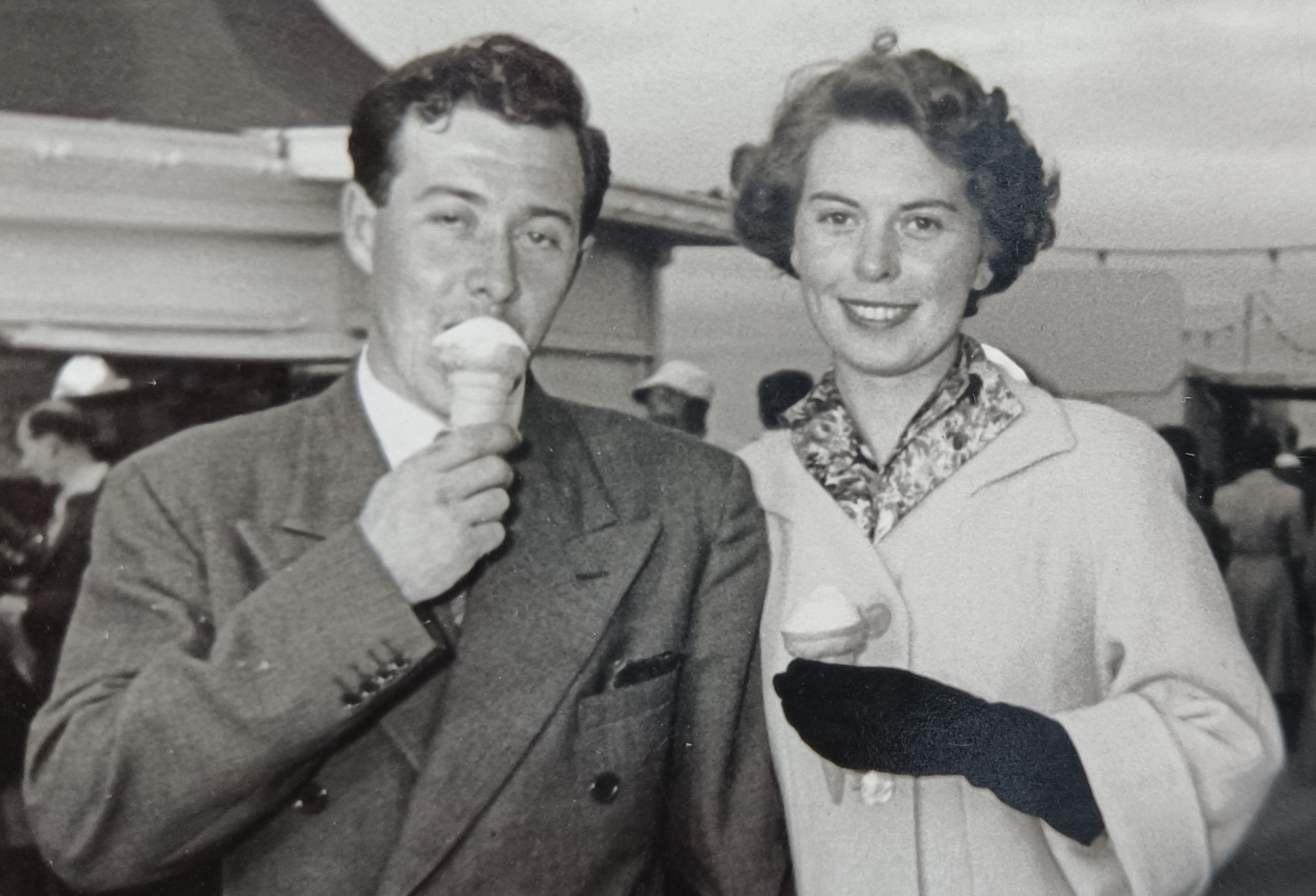 Janet and Gerald met at the wedding of a friend, Victor Buckland. Victor’s mother and Janet’s mother were friends and the Gerald and Janet met whilst looking for a way into the church along the circuitous pathways of the church grounds. They were married in 1957 and this photograph was taken in Paignton, on their honeymoon. They lived with Janet’s mum for 2 years before building their family bungalow (in which they still live) on the family plot. Children came along with the birth of sons Neil and Mark, grandchildren Bryony, Megan and Kevin and great grandchildren Scarlett, Henry and Poppy. Photograph at their Golden Wedding in 2007.