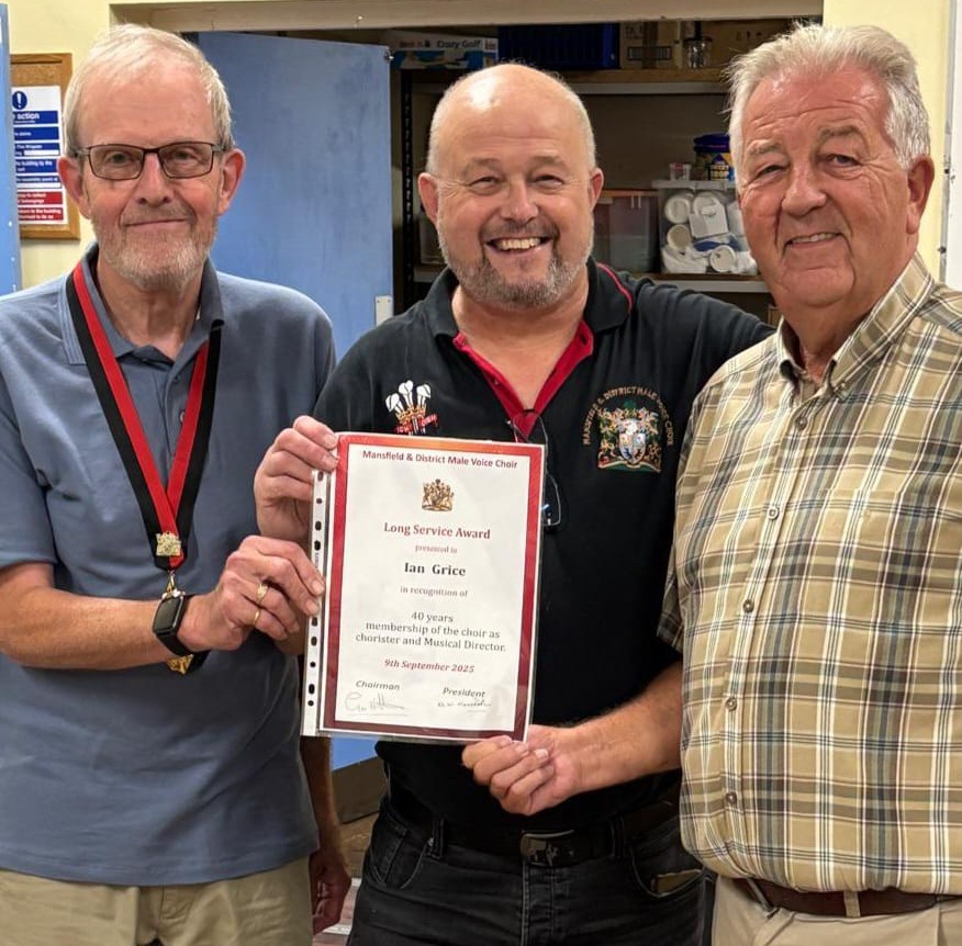 His Christian beliefs brought him to the choir as, at that time, many male voice choirs had their roots in churches and in this area the mining industry. Mansfield and District Male Voice Choir can trace its formation back to Rainworth Methodist church where, the choir was inaugurated in 1926 before combining with Mansfield Orpheus in 1944. In 2024 our choir celebrated its 80th anniversary and a moment’s reflection reveals that Ian has been involved for half the life of the choir and 2/3rd of his life…………that is belief and commitment personified.
